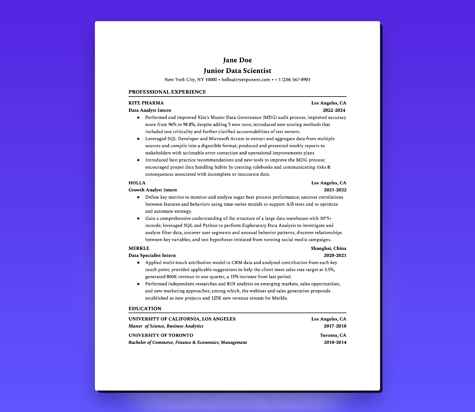 - Quantified Achievements: This resume effectively quantifies accomplishments, such as improving MDG accuracy from 96% to 98.8% and driving a 15% revenue increase at Merkle.