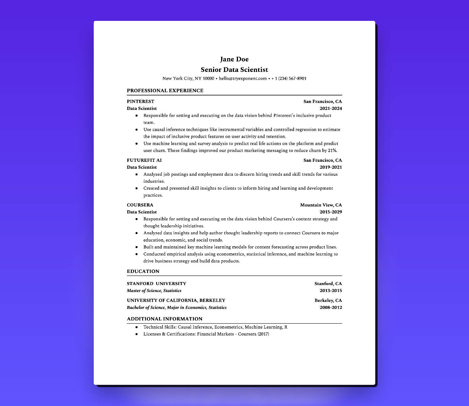 Data Scientist with a strong track record of leveraging advanced statistical techniques and machine learning to drive strategic decision-making and business outcomes at scale. At Pinterest, I spearheaded data initiatives that enhanced product marketing, reducing user churn by 21%. I seek to apply my expertise in a forward-thinking organization, aiming to lead data-driven innovations in the tech industry.