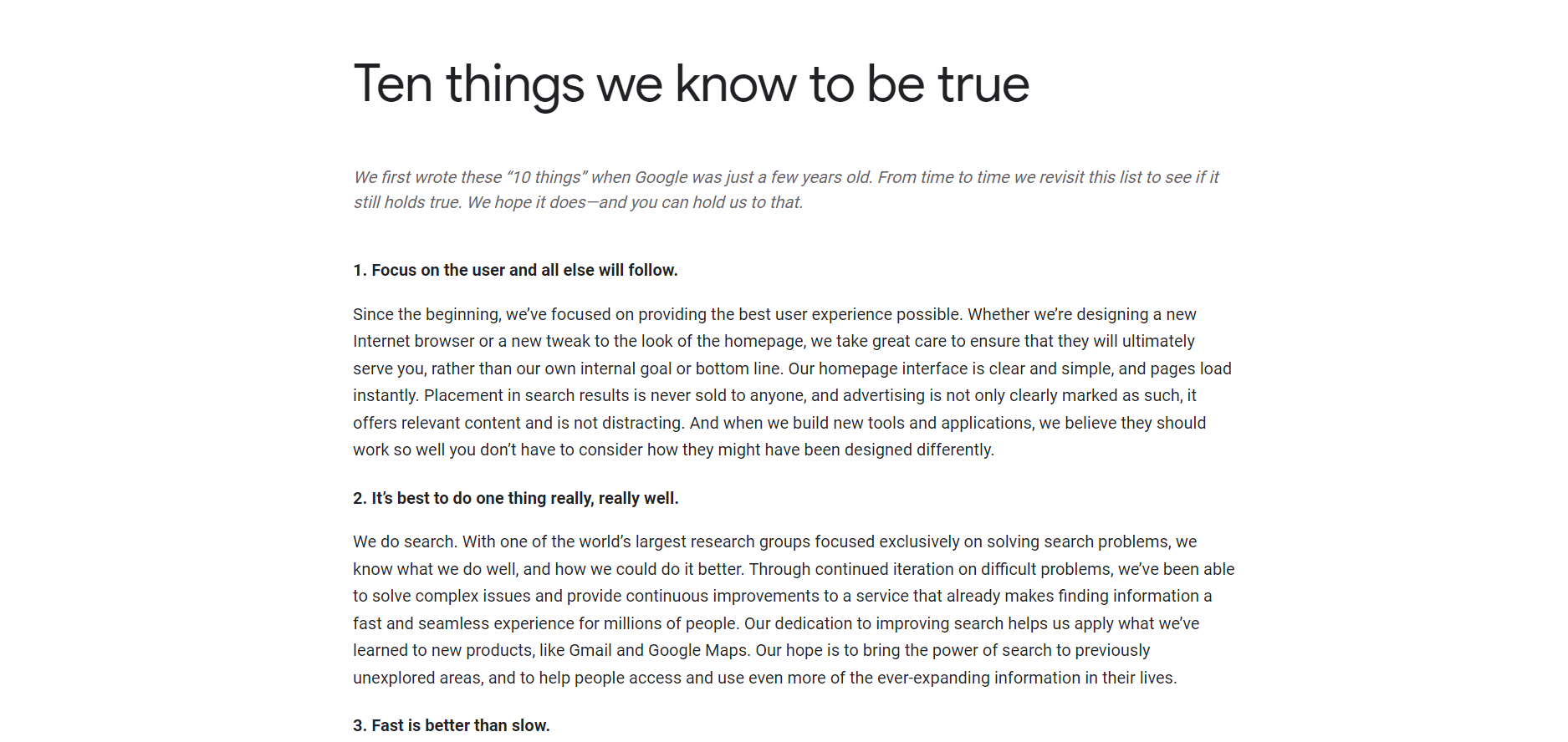 Google's "Ten Things We Know to Be True"