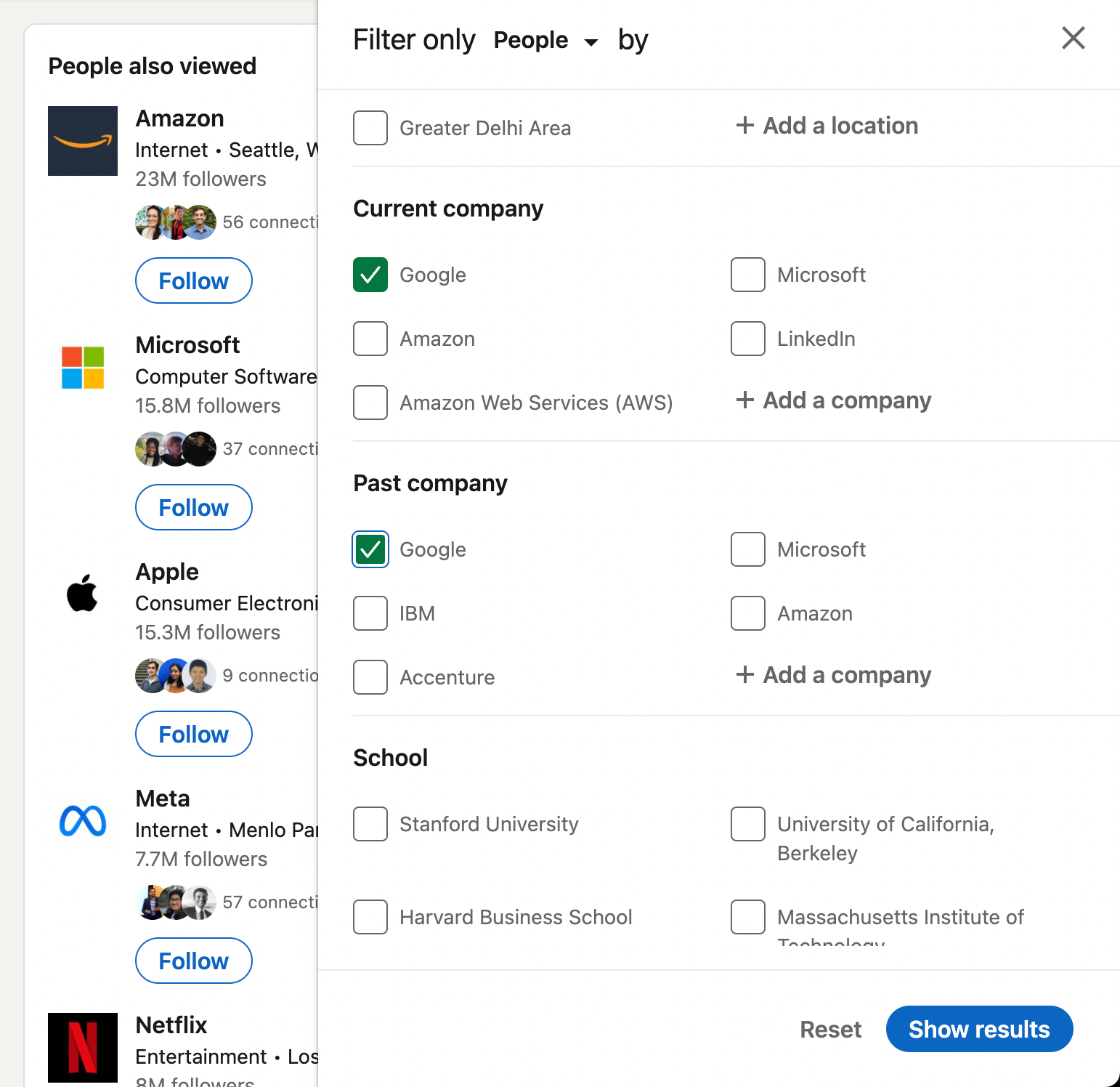 Note that you'll also want to filter by 1st degree connections or 2nd degree connections to see the individuals that are in your network. We've included the filter for past company in case those who used to work at Google could reach out to others they know at the company.
