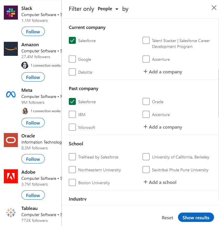 In LinkedIn search, search for the company you're applying to (in this case, Salesforce), and click "All Filters" to see a panel like the one: