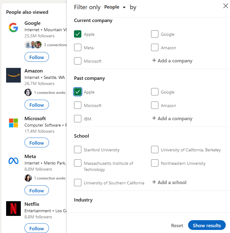 LinkedIn has several powerful search features that make tracking down Apple employees a breeze.