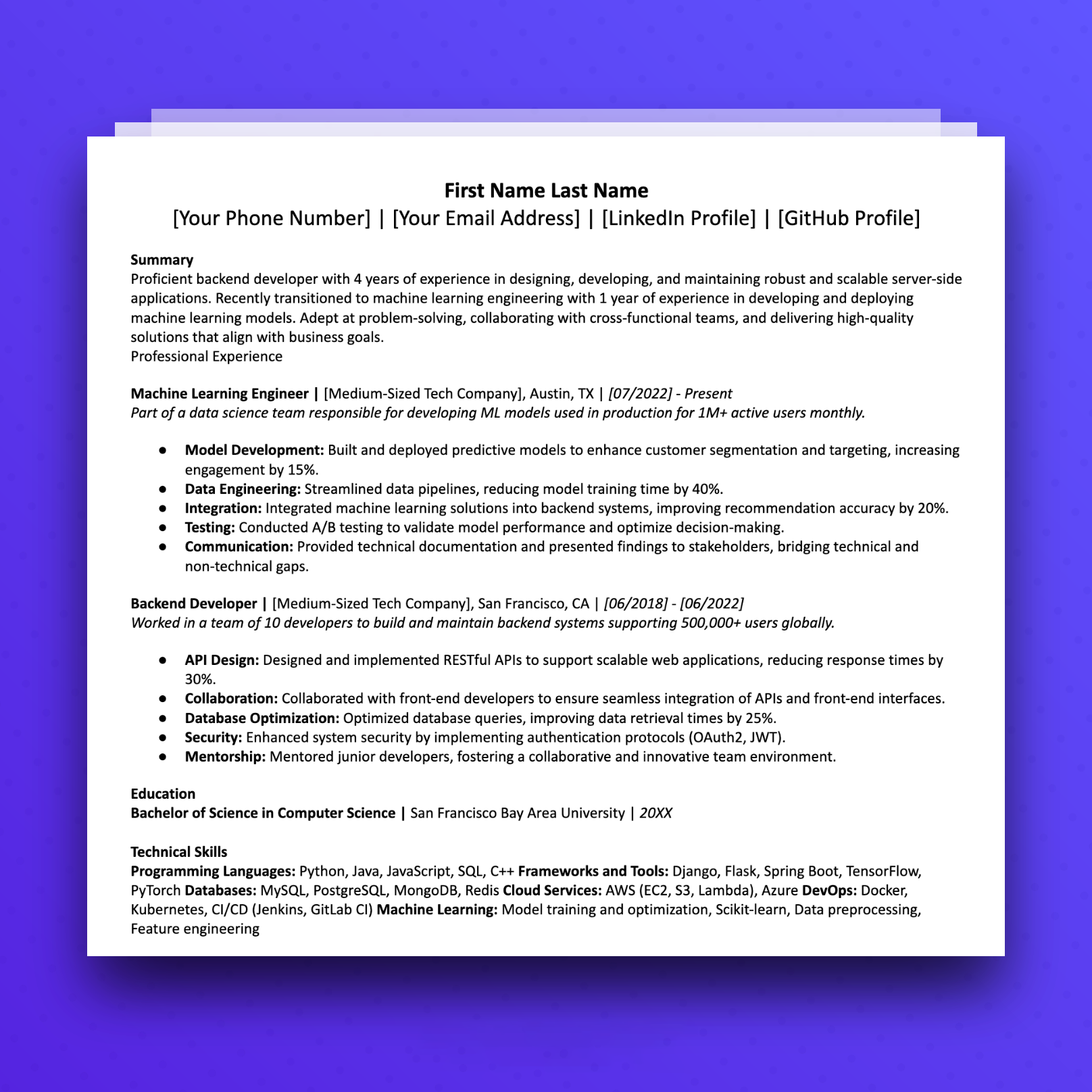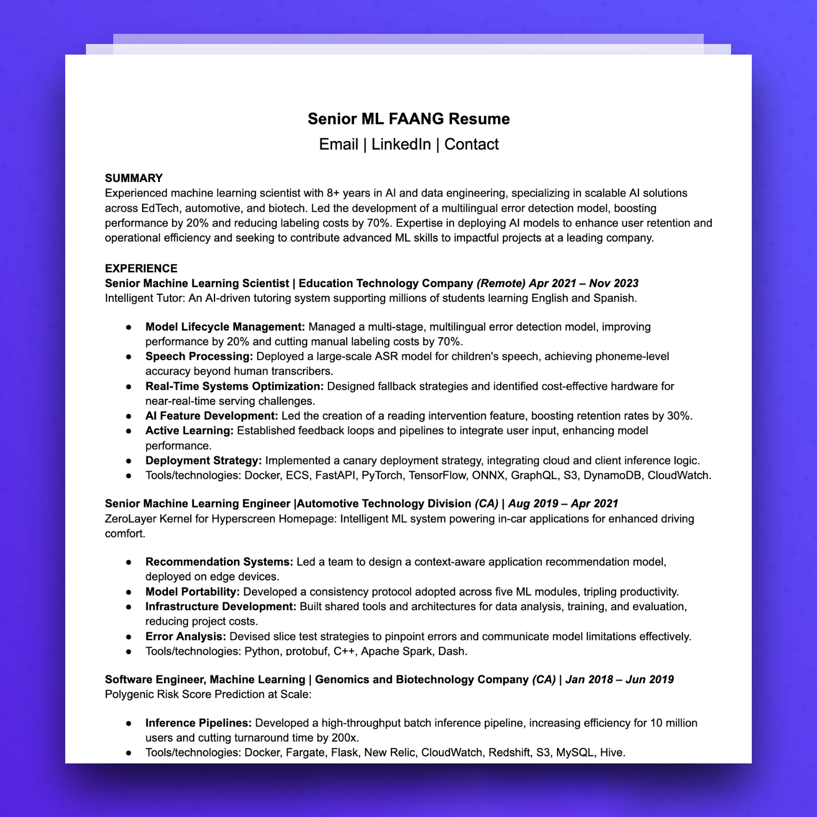 This resume strikes a perfect balance of technical depth, measurable achievements, and effective storytelling, making it compelling for technical hiring teams; moreover, the candidate successfully transitioned into a Senior MLE role at a FAANG company recently.