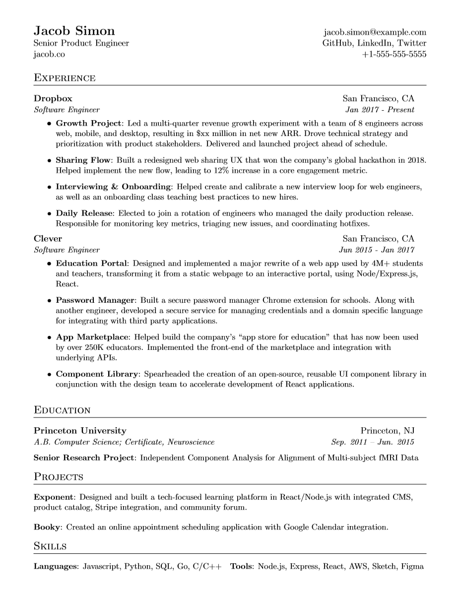 - Skip the summary section. Save this valuable real estate for the most important segments - work experience and projects. There are exceptions to this rule: if you’re transitioning from a different career, a succinct summary explaining the reason for your switch and showcasing your passion for software can be helpful. Alternatively, if you’re a brand new grad and you’re struggling to fill the space, you could consider a summary. But we challenge you to reach higher - fill that space with personal projects that will make you shine. More on that below.
