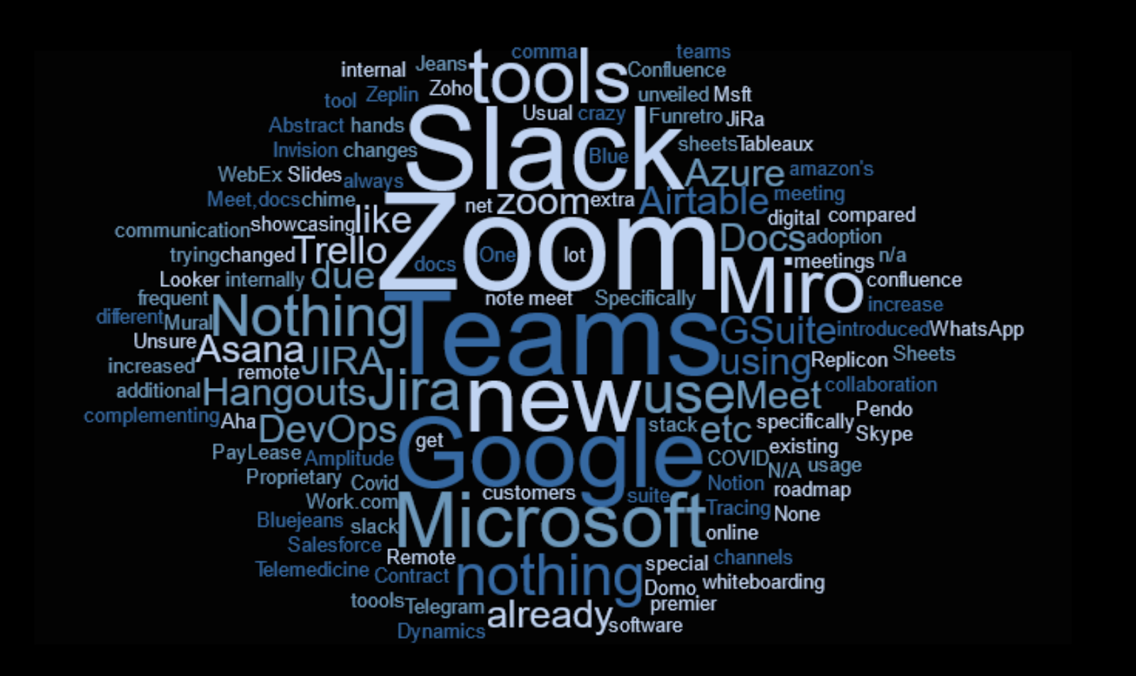 A surprising number of respondents reported no change, as the most popular tools (Slack, Zoom, MS Teams, GSuite, etc.) were all in use in some capacity before COVID-19. JIRA, Miro, Trello are on the rise, and a few PMs mentioned proprietary internal tools had been developed.