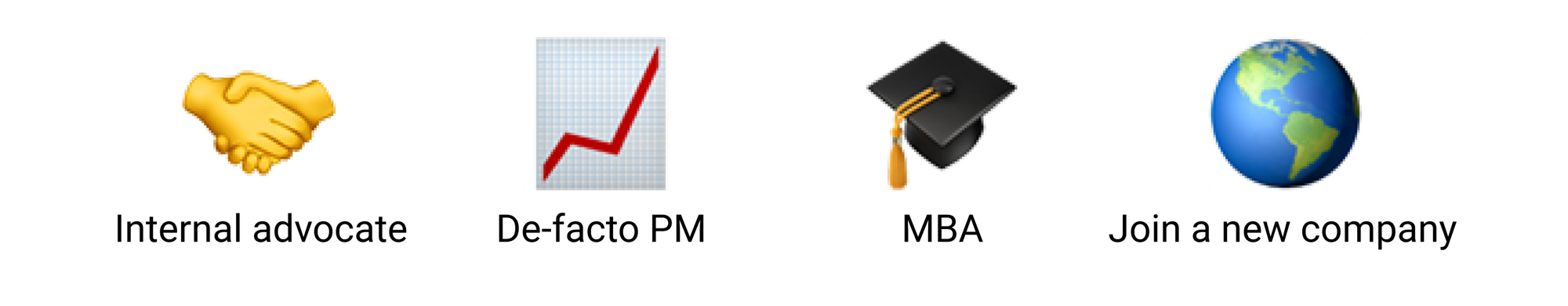 If you work at a smaller company, where there may not be as many internal advocates to help mentor you, nor a well-defined hiring process, I recommend becoming a de-facto PM. As smaller companies grow, there may be more opportunity for you to take on product management tasks on your own, doing what needs to be done to get your team’s product out on time. Here’s what that looks like: