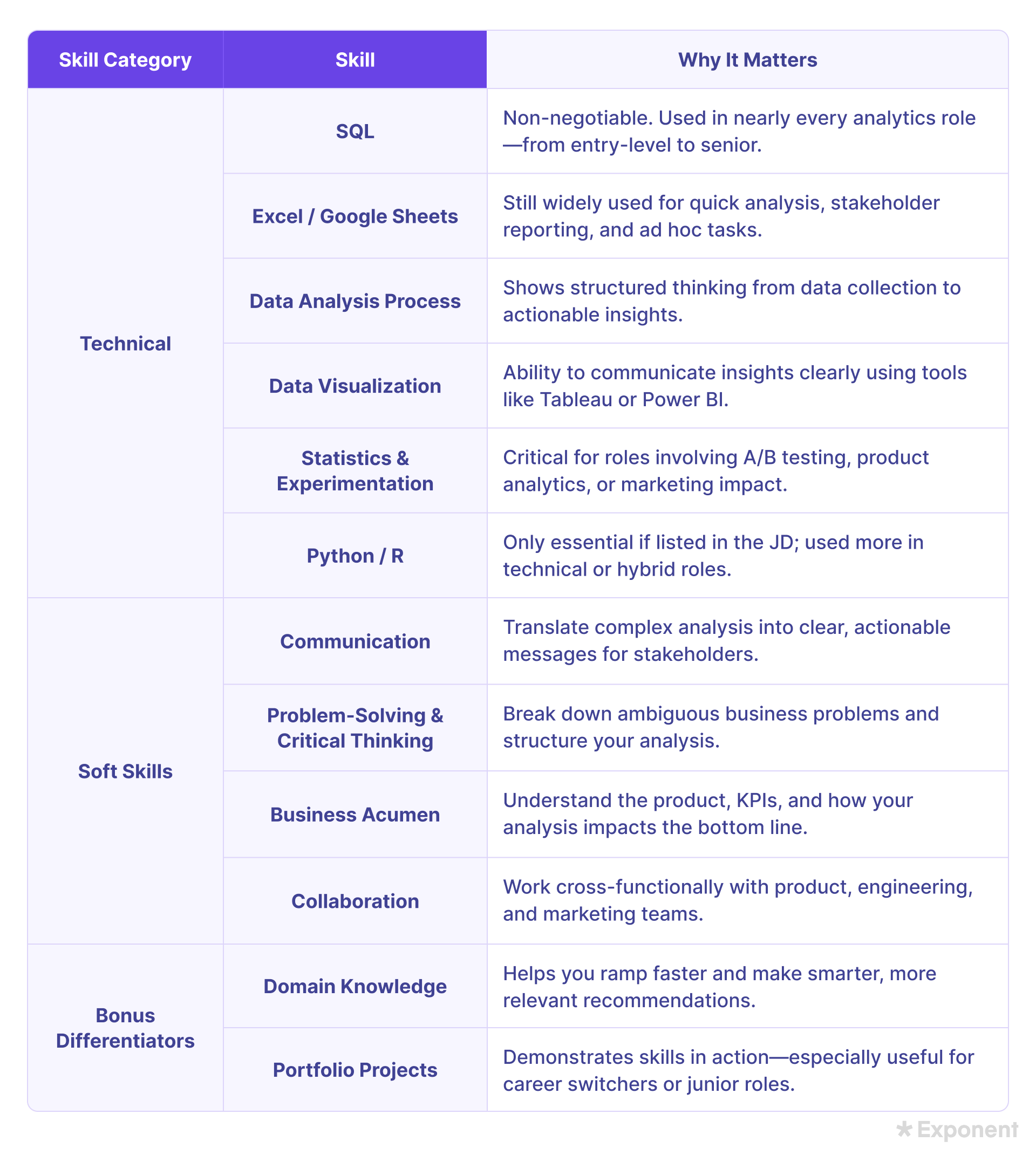 - Domain Knowledge: Familiarity with your company’s industry (e.g., healthcare, finance, e-commerce) helps you ramp up faster and recommend smarter solutions.